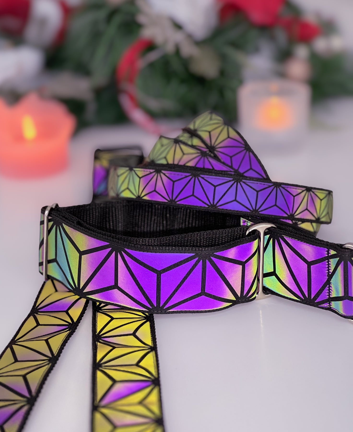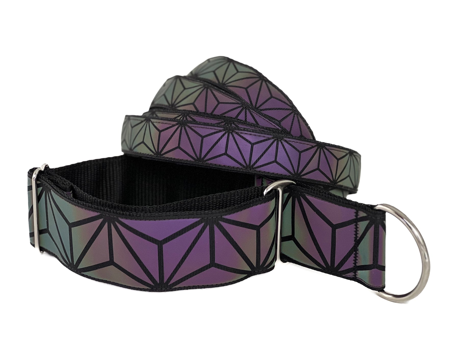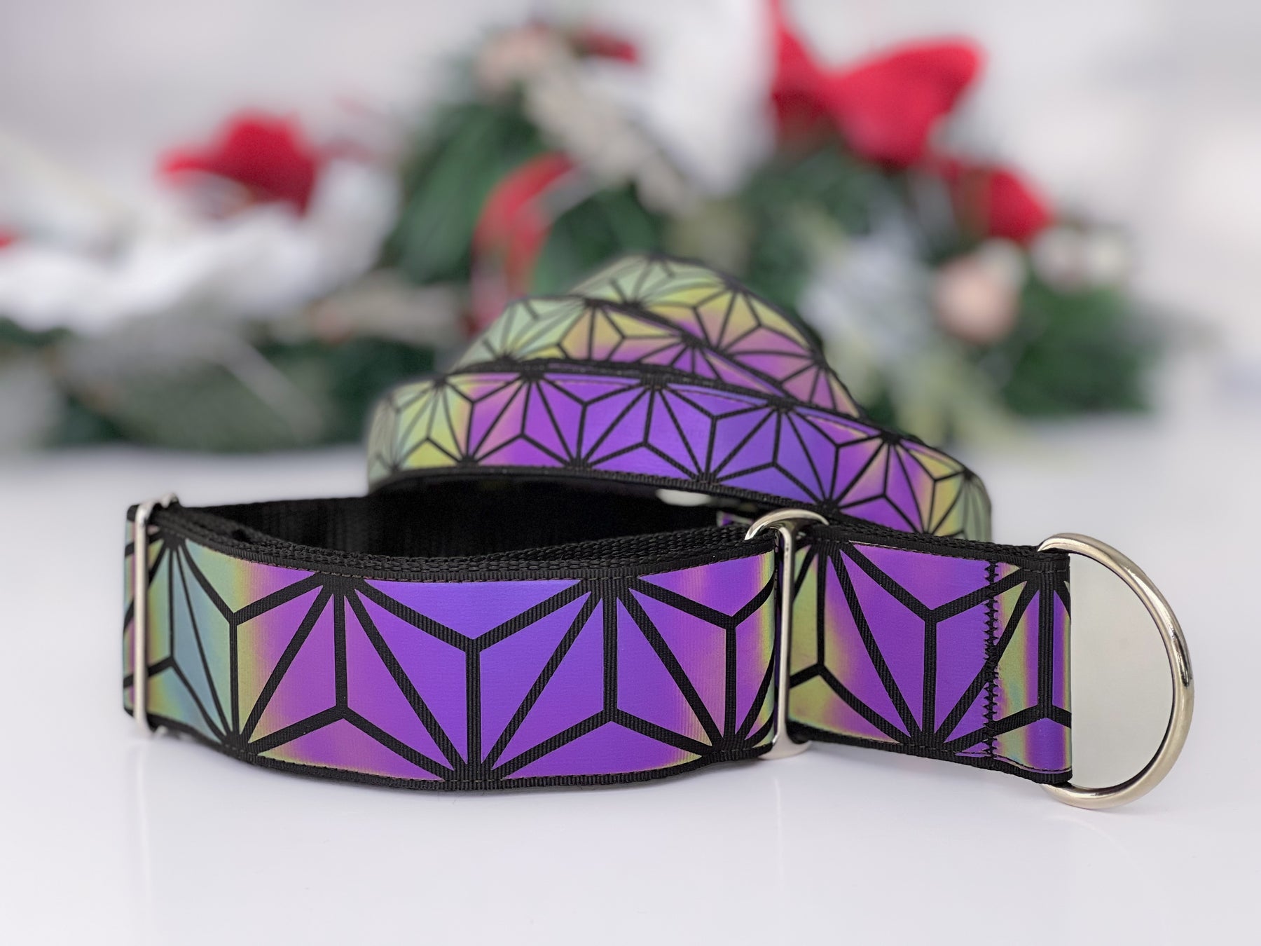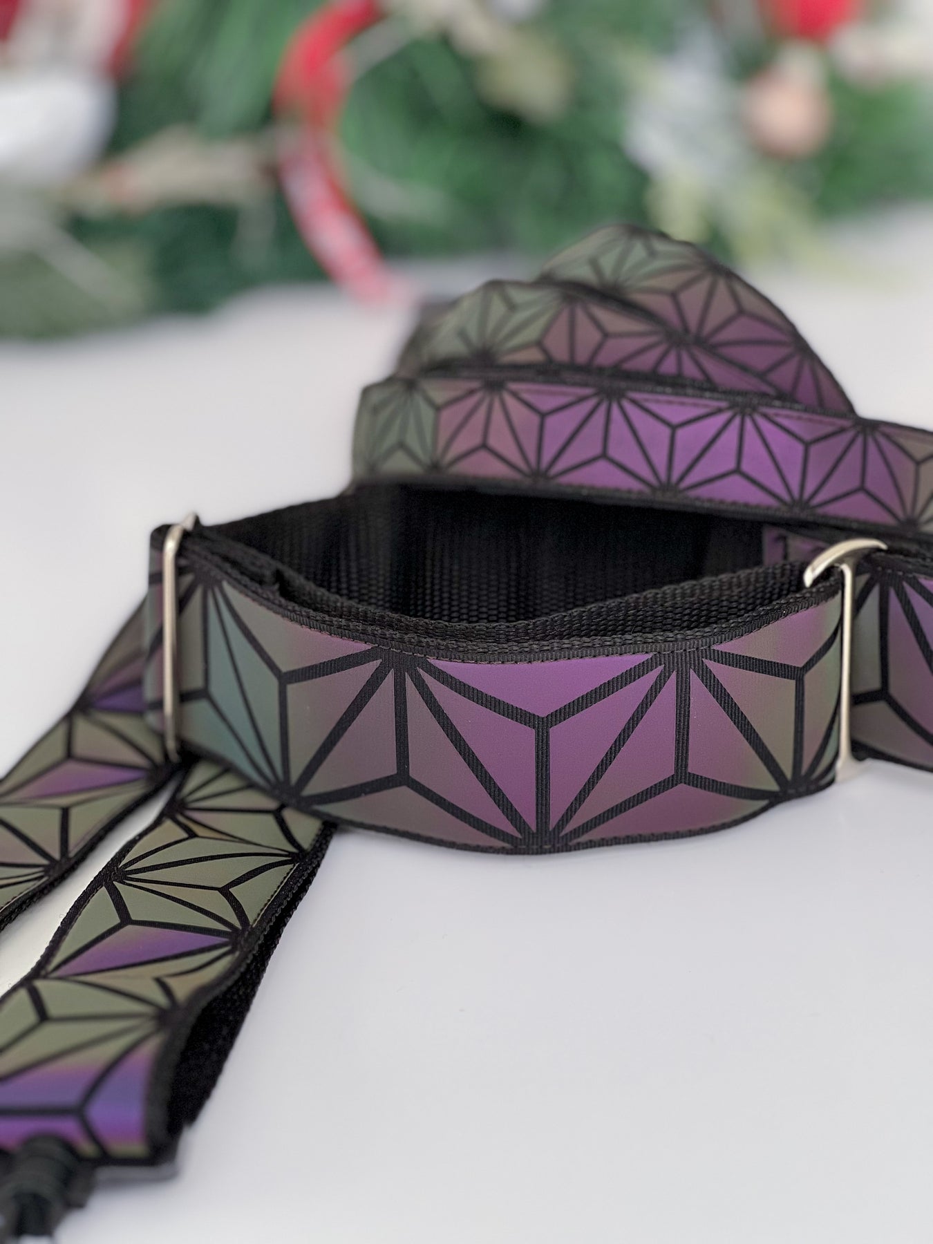 • Valmistettu heijastavasta polyesteri nauhasta, jonka kuviot antavat upean sateenkaaren värisen heijasteen valon osuessa siihen pimeässä. Päivänvalossa pannan pinta on tyylikkään tumma.  Pinta hohtaa hennosti eri värejä myös päivällä valon osuessa siihen oikeassa kulmassa.